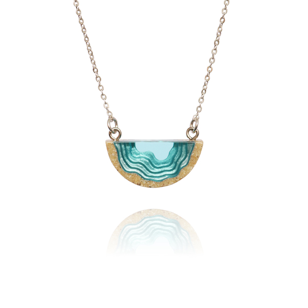 Drawing inspiration from the geographic shape of an inlet, this design showcases a small, semi-circular pendant carefully handcrafted from bonded sand, aquamarine or ultramarine blue resin and metal pigments. The pendant is elegantly connected to a 50cm/20" long fine link chain by two eye screws, complete with a 5cm/2" extender featuring our distinctive leaf-shaped tag adorned with our engraved logo.