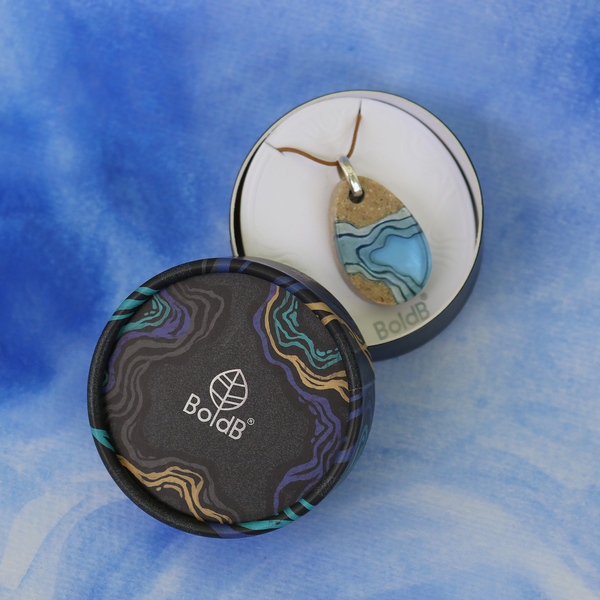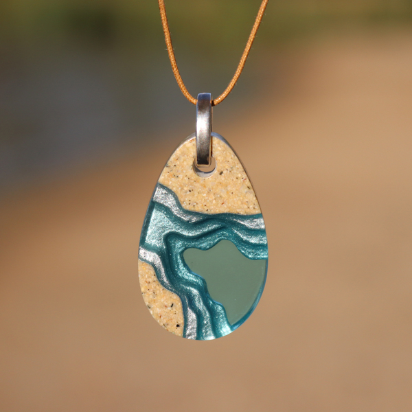 Taking inspiration from the geographic contours of a cove, this tear-drop-shaped necklace design is meticulously handcrafted from bonded beach sand, aquamarine or ultramarine blue resin, and metal pigments. The pendant is elegantly connected to its caramel brown cord by a free-swinging hook, while a sliding knot allows you to adjust the cord's length up to 30"/76cm for a perfect fit.