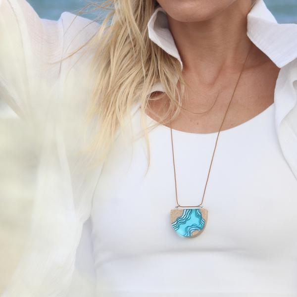 Our Waterway Necklace has been carefully handmade from bonded sand, aqua blue resin and metal pigments with a high-gloss polished finish. Two eye screws together with two jumps rings connect the pendant to its caramel brown cord. The cord has a sliding knot to adjust its length.