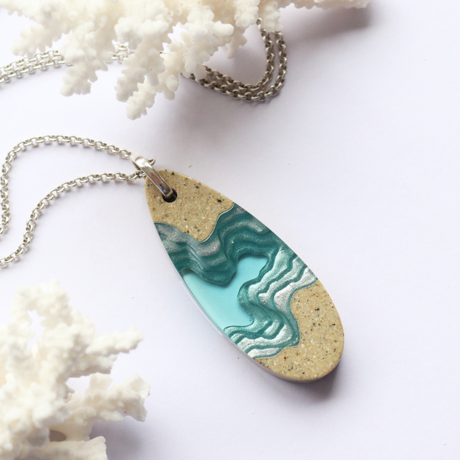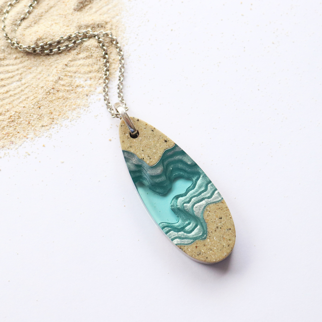Our long-bodied Fjord pendant has been carefully handmade from bonded sand, aquamarine blue resin and metal pigments with a high-gloss polished finish. A free-swinging metal hook connects the pendant to a 28"/71cm cable link chain with 2"/5cm extender.