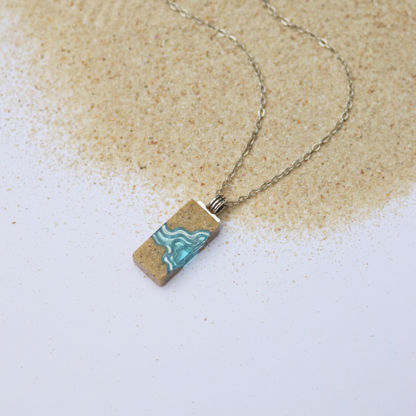 Our Delta necklace showcases a minimalist rectangle design, with layers that mimic the topography of a river mouth meeting the ocean, inspiring its name. The necklace is carefully crafted from bonded beach sand and blue resin and dangles on an 18”/45cm cable link chain with a 2”/5cm extender.