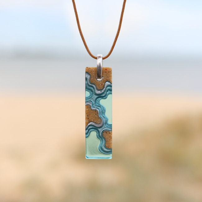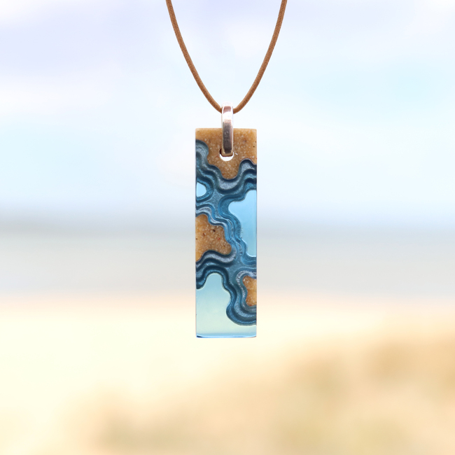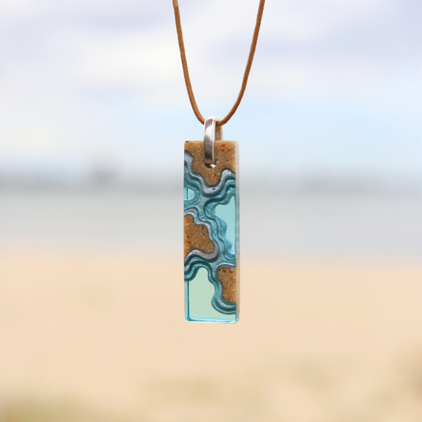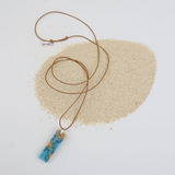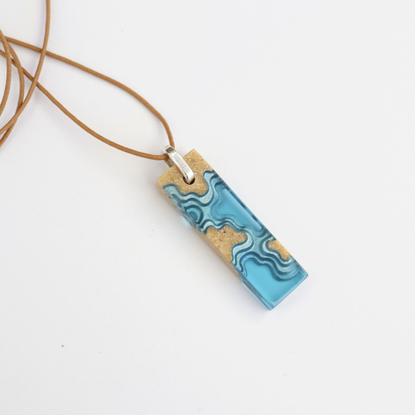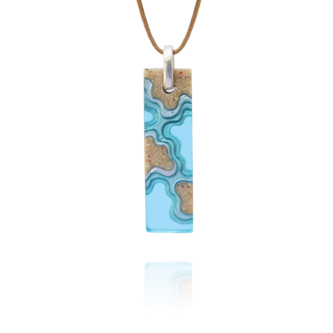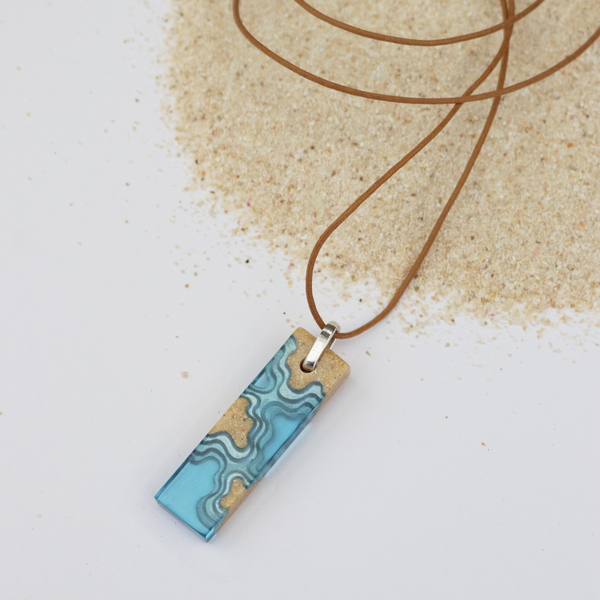 Our Islands necklace showcases a long rectangular pendant with layered textures that evoke the topography of three nearby islands, inspiring its name. Made from bonded beach sand and blue resin, the pendant is suspended on a handcrafted hook, attached to a caramel brown cord with a sliding knot for adjustable length. The cord can be extended up to a maximum length of 28”/70cm.