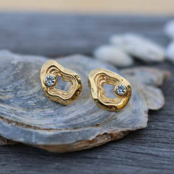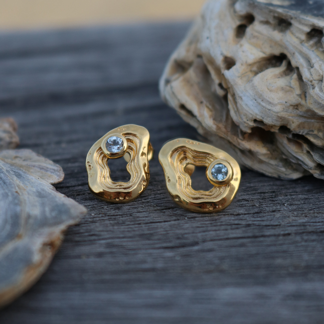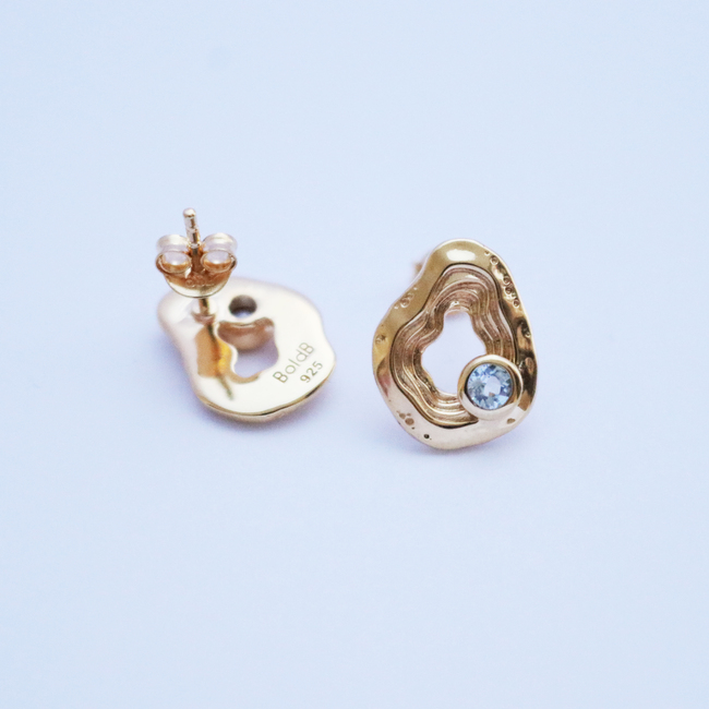 ...The Serenity Collection draws inspiration from the serene beauty of the ocean and its shores. Our Oasis ear studs have been carefully crafted by Balinese silversmiths from environmentally friendly recycled 925 sterling silver with 18K gold plating. Beautiful light blue Topaz gemstones aim to resemble the shimmering essence of water.