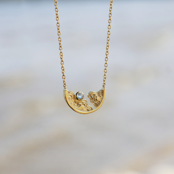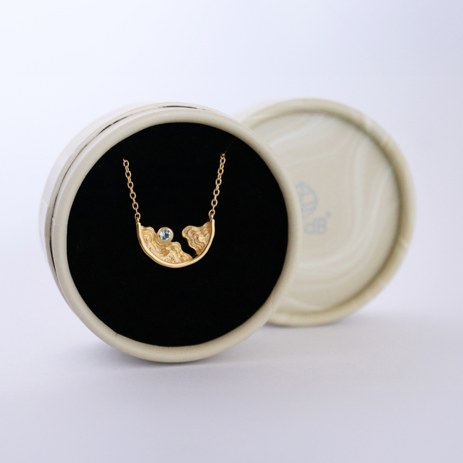 The Serenity Collection draws inspiration from the serene beauty of the ocean and its shores. Our Paradise necklace has been carefully crafted by Balinese silversmiths from environmentally friendly recycled 925 sterling silver with 18K gold plating. The design features a beautiful light blue Topaz gemstone, evoking the shimmering essence of water.