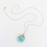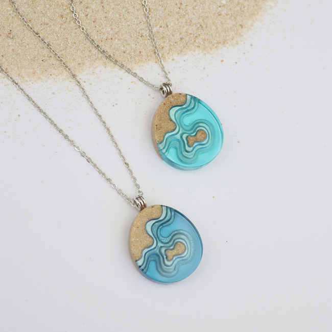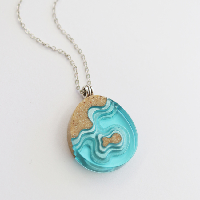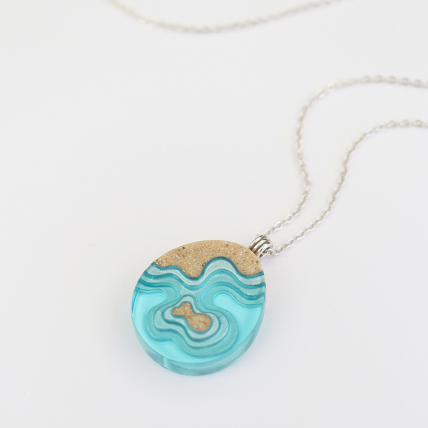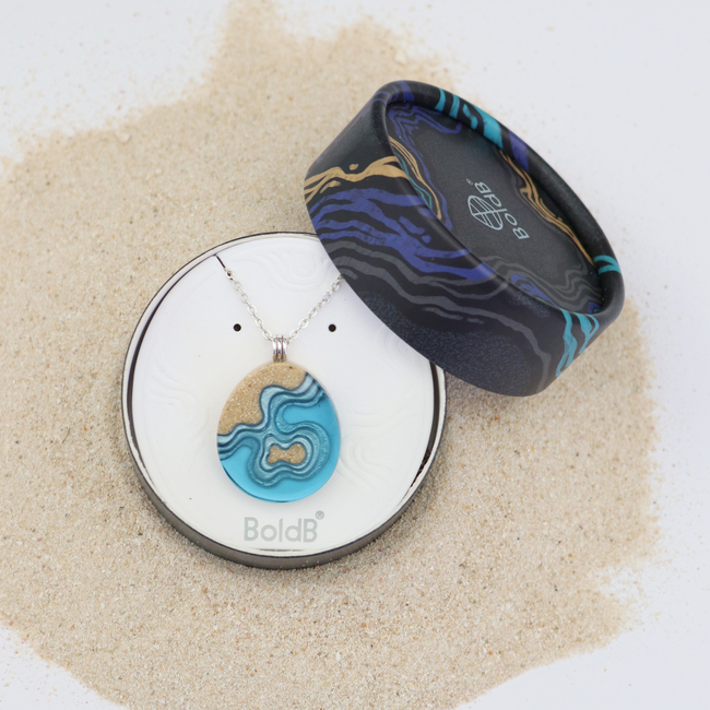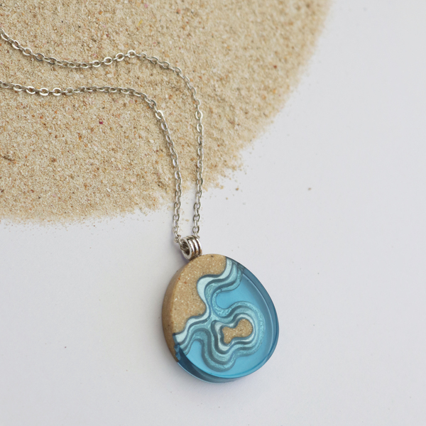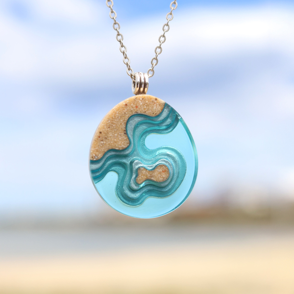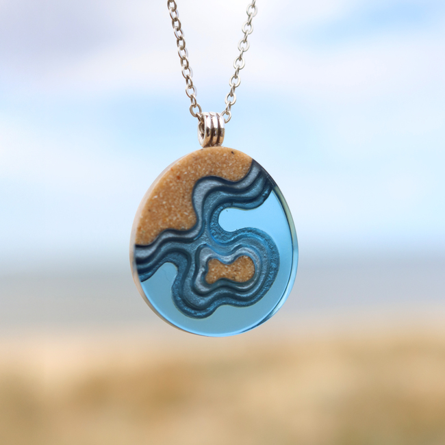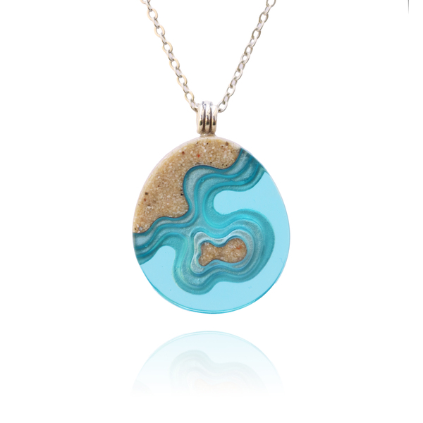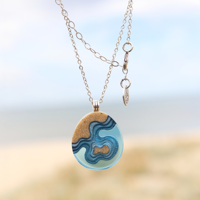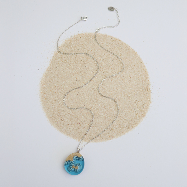 Our Promontory necklace showcases a wide tear drop shaped design, with layers that mimic the topography of a Promontory pertruding into the ocean. The necklace is carefully crafted from bonded beach sand and blue resin and dangles on an 20”/50cm cable link chain with a 2”/5cm extender.