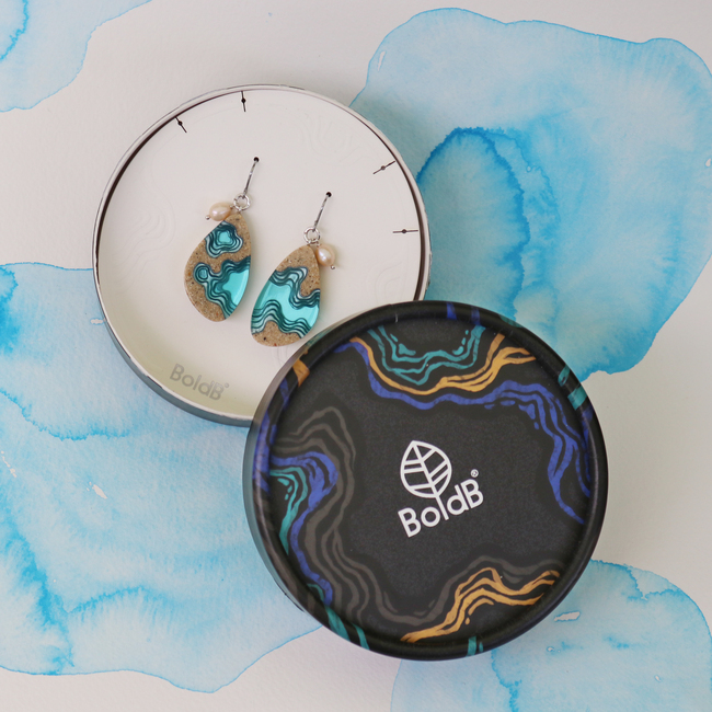 The Rockpool earrings are the largest earrings from our Aqua collection and ideal for those who love to make a statement. They feature a unique asymmetrical tear drop shape and have been crafted from bonded sand, blue resin and silver metal pigments covering the delicate topographic layers of the earrings. Each earring features a delicate freshwater pearl with a beautiful slightly peach pink luster. The ear hooks are made from allergy friendly stainless steel.