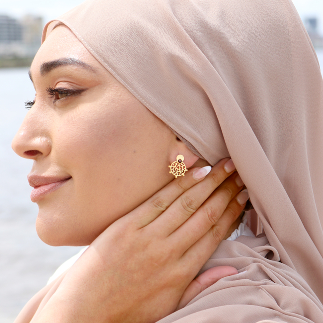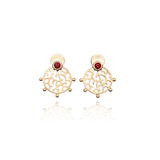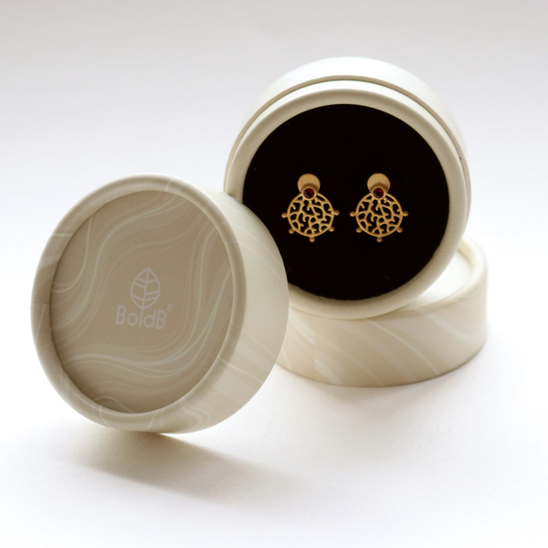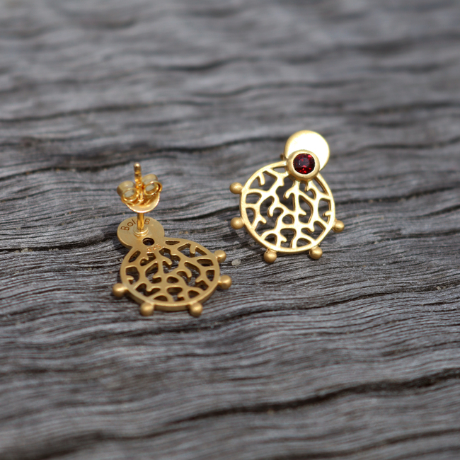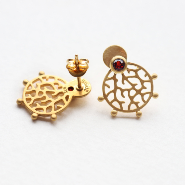 Our Roseni Stud Earrings have been named after the coral species Acropora Roseni and feature a compact round shape with branching coral patterns and a 3mm natural rich red garnet stone. Delicate metal balls decorate the boundary of the design. The ear studs have been crafted from sustainable recycled 925 sterling silver and 18K gold plated before being carefully hand bushed to an elegant matte surface finish.