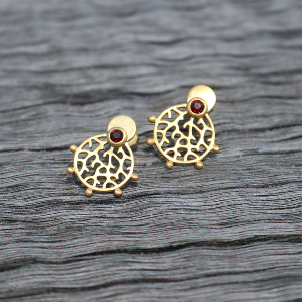 Our Roseni Stud Earrings have been named after the coral species Acropora Roseni and feature a compact round shape with branching coral patterns and a 3mm natural rich red garnet stone. Delicate metal balls decorate the boundary of the design. The ear studs have been crafted from sustainable recycled 925 sterling silver and 18K gold plated before being carefully hand bushed to an elegant matte surface finish.