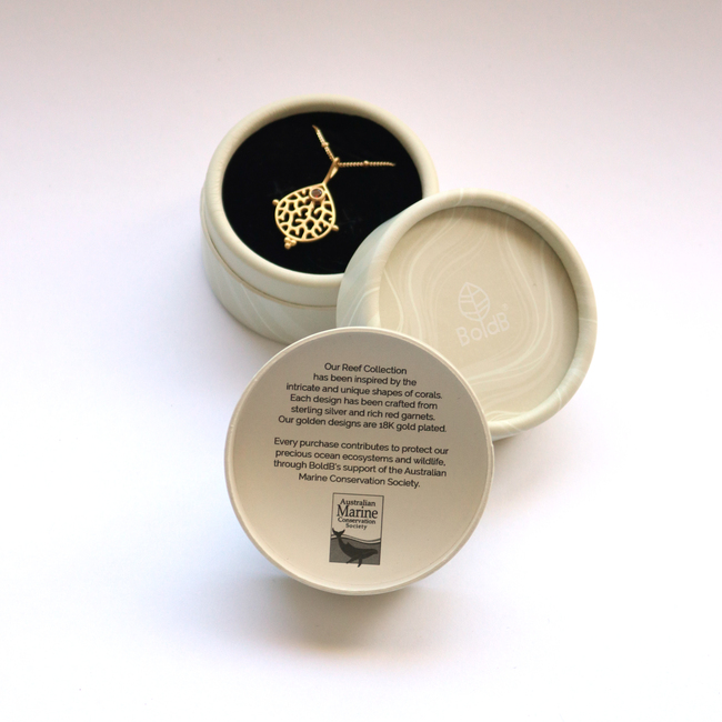Our Selago Necklace has been named after the coral species Acropora Selago. The design features a 3mm natural rich red garnet stone and branching coral pattern with delicate metal balls decorating the tear drop shaped boundary of the pendant. The pendant has been carefully hand brushed to an elegant matte finish. The pendant rests on a 44cm long delicate polished cable link chain featuring small metal balls and a 5cm chain extender featuring our logo. The pendant and chain have been crafted from sustainable recycled 925 sterling silver and 18K gold plated.