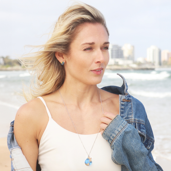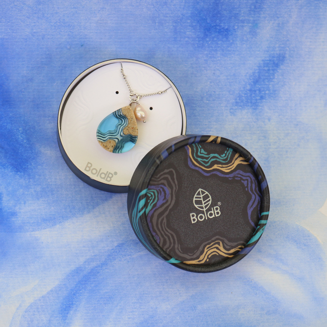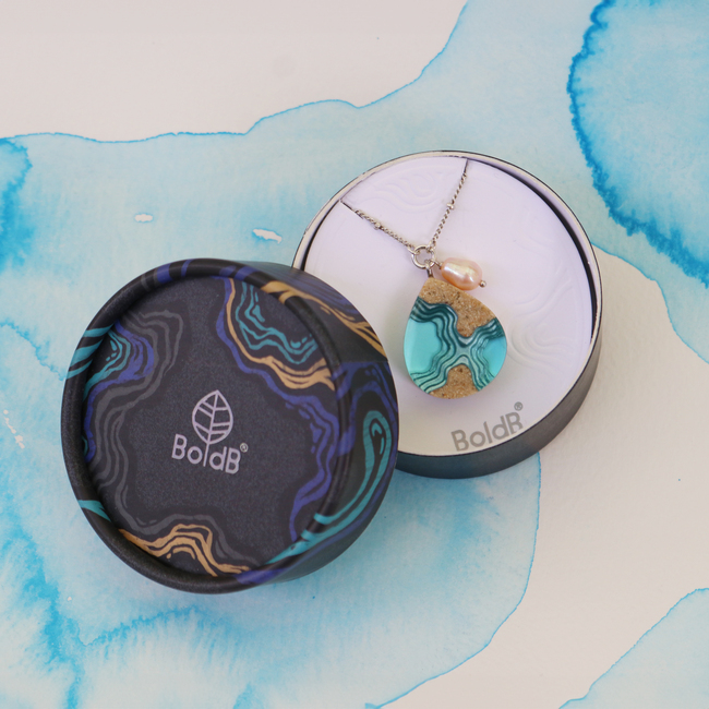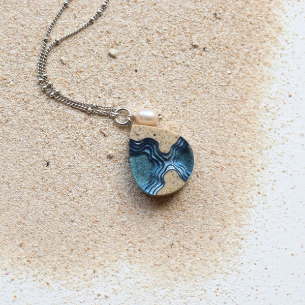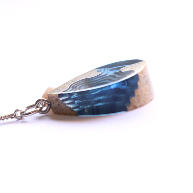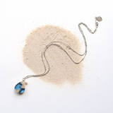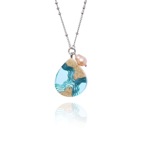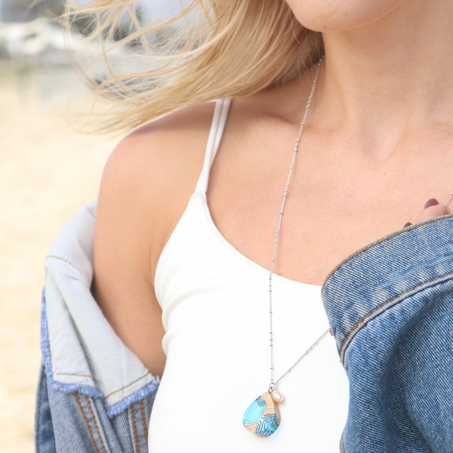 Our Tombolo Necklace features a tear drop shape and has been handcrafted from bonded sand, aqua or ultramarine blue resin and metal pigments with a high-gloss polished finish. A delicate freshwater pearl with a slightly peachy-pink luster compliments the design. The pendant rests on a delicate 65 cm long cable link chain featuring small metal balls. A 5 cm extender with our leaf logo enables you to adjust the length of the chain.
